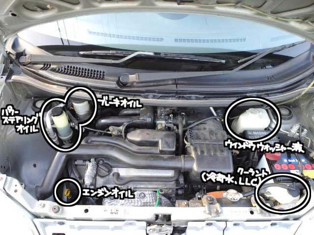 ウチのクルマだと、クラッチ/ブレーキフルード、ウォッシャー/I/C用ウォータータンク、エンジンオイル&レベルゲージ辺りですかね?