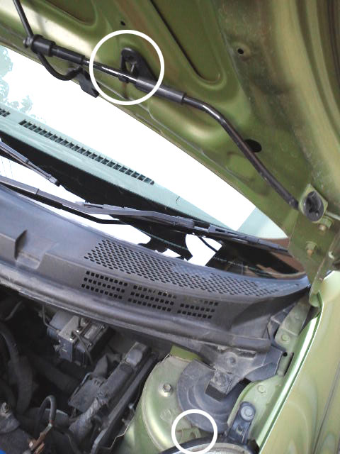 ボンネットが開いてる図で説明)ボンネットを固定する棒は、ボンネット側に固定されています(上の○印)。