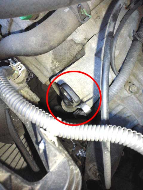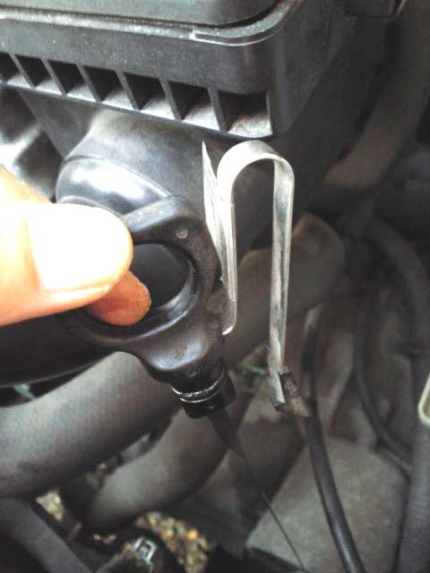 ちなみにこの黒いゲージ棒はオートマチックフルード(ATF)です。エンジンオイルのゲージ棒と違ってフックとステッカーが付いています。